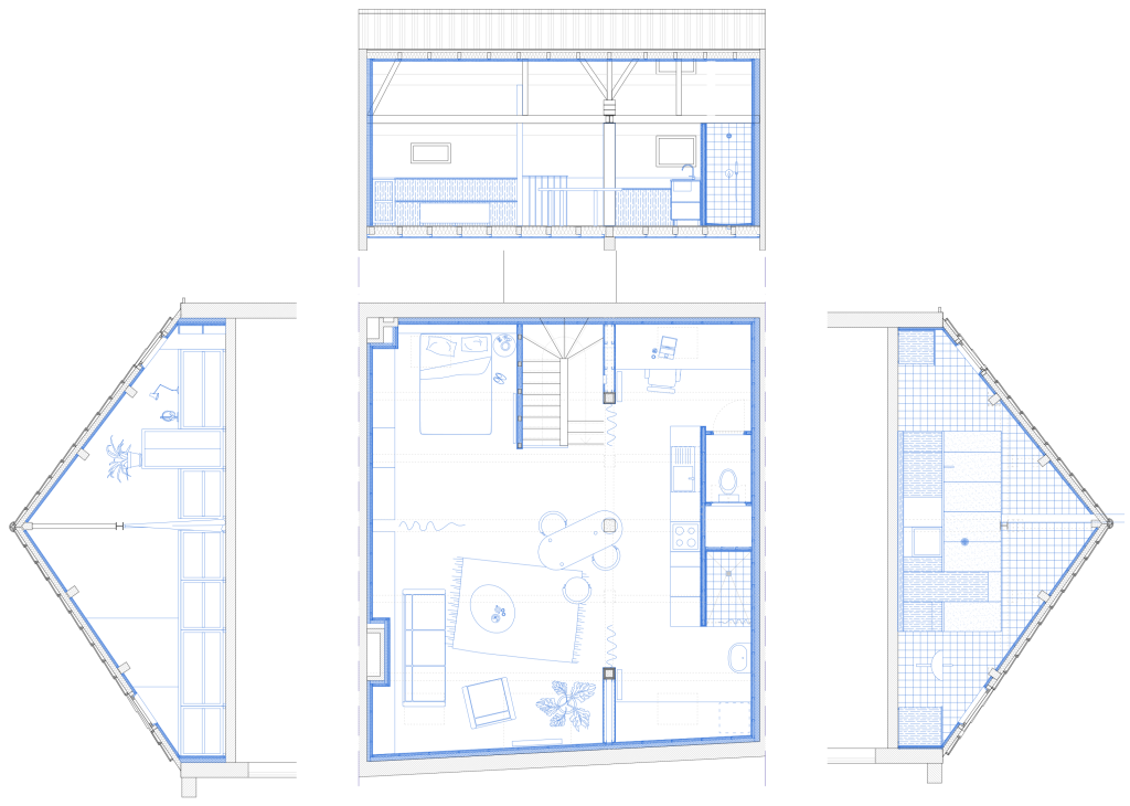 La première est que le projet est partiellement autoconstruit, les clients ayant eux-mêmes réalisé les travaux ou dirigés ces derniers. Pour cette raison, Leïla et Mircea, qui ont des compétences aussi bien techniques qu’esthétiques, ont été particulièrement investis dans les choix de conception, et dans la sélection des matériaux et de leurs mises en œuvre.