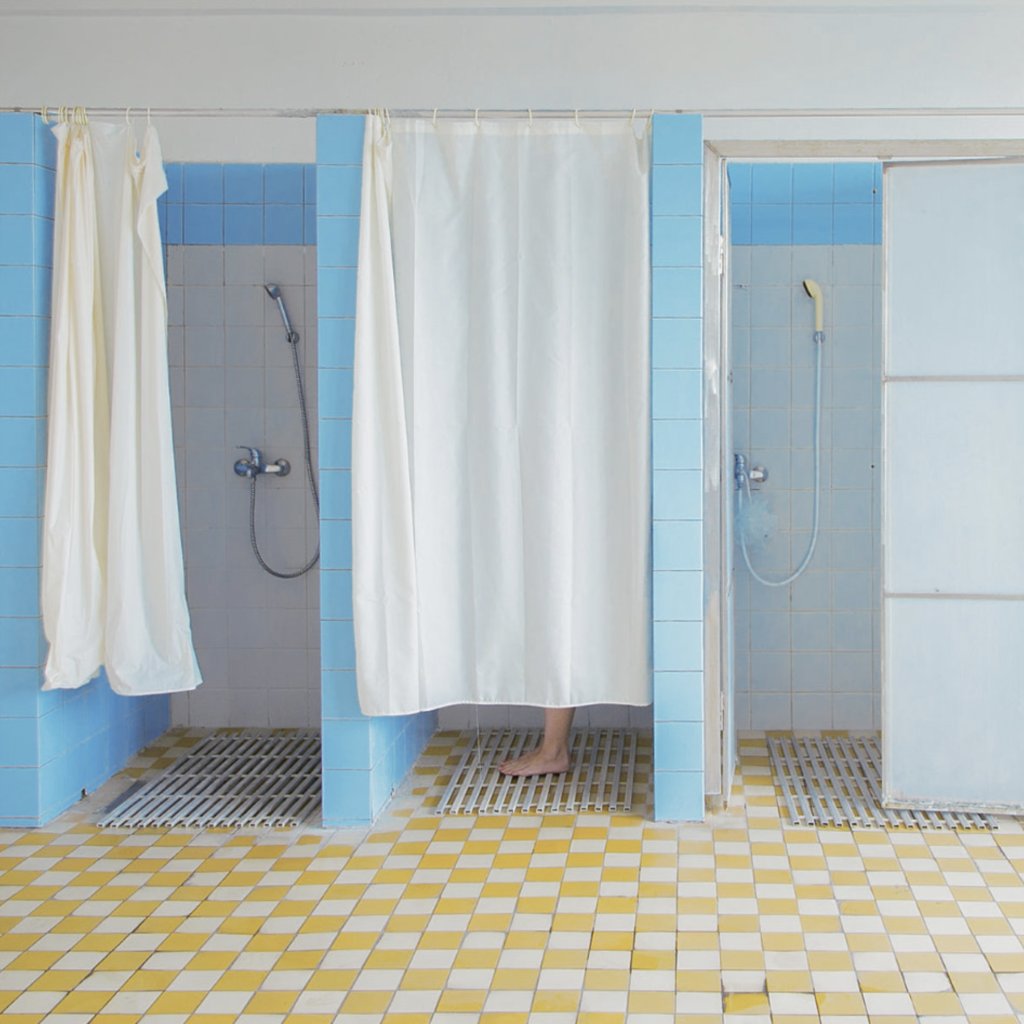 Le projet s’organise en deux phases. La première, réalisée à l’été 2023, vise à transformer l’usage quotidien du foyer. Elle passe par la réalisation d’un vestiaire d’abord, dont les pavés de verre floutent les vêtements et diffractent la lumière, introduisant un univers vaporeux. À cela s’ajoutent des casiers jaune vif placés dans des alcôves. De larges rideaux bleus dessinent un fond de scène qui met en valeur les escaliers conduisant à la salle principale. Volontairement « trop courts » comme souvent les rideaux de douche, ils laissent deviner plinthes carrelées, mobiliers colorés, et parfois, les chevilles des visiteur·ices.